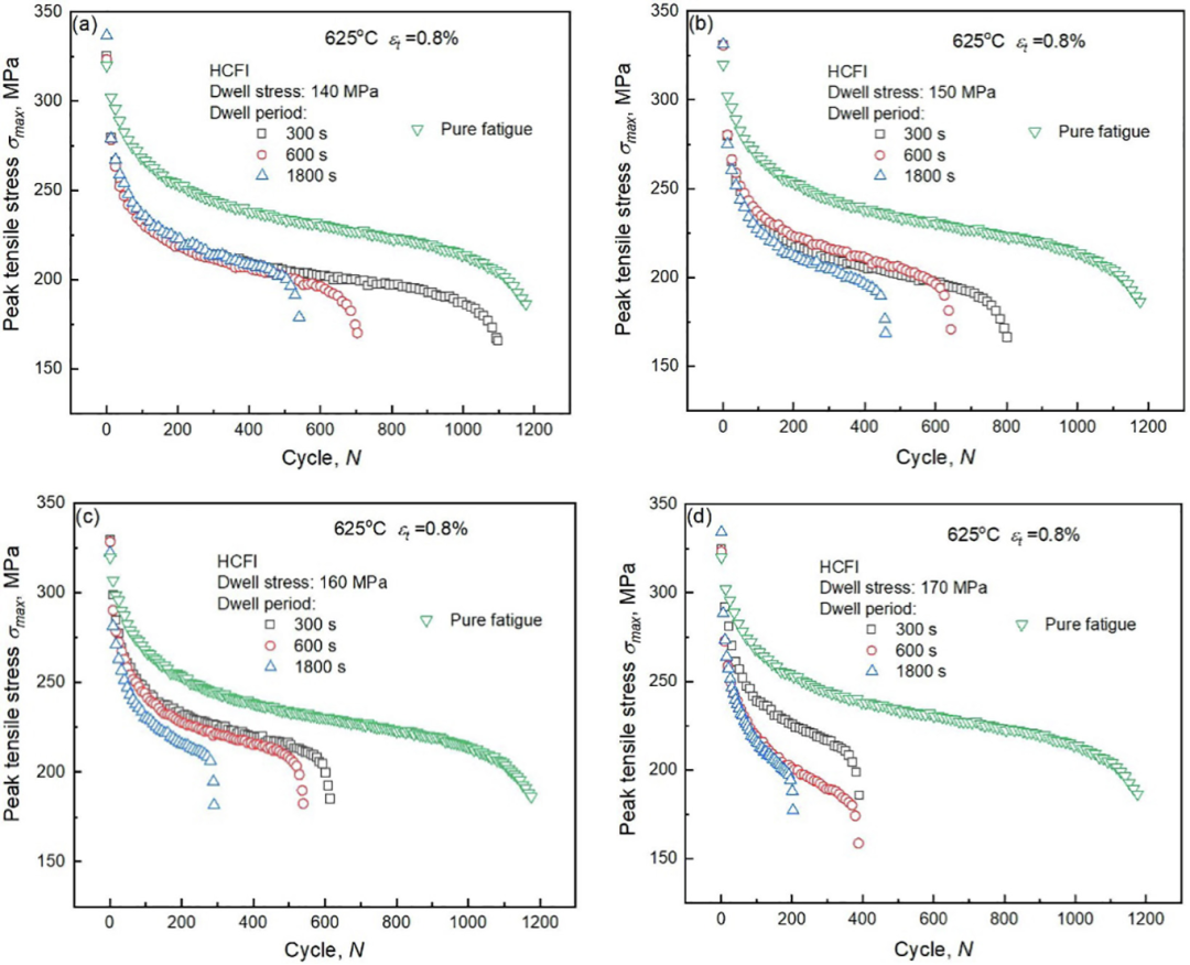 下图是不同停留时间以及对应应力下,随着循环次数的增加,试样峰值拉伸应力的变化情况。图中展示了140MPa(a)、150MPa(b)、160MPa(c)、170MPa(d)四种应力以及300秒(图中黑色线)、600秒(图中红色线)、1800秒(图中蓝色线)四种停留时间与纯疲劳加载(PF,图中绿色线)的对比。图表横坐标为HCFI循环次数(N),纵坐标为试样最大拉伸应力(MPa)。