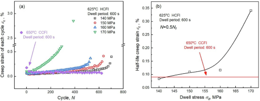 下图分别展现了试验中在不同的停留时间应力下,循环周期对试样蠕变应变速度的影响(左图),以及不同停留时间应力对试样半衰期蠕变应变程度的影响(右图),同时引入传统的蠕变-疲劳相互作用(CCFI)试验进行对照。